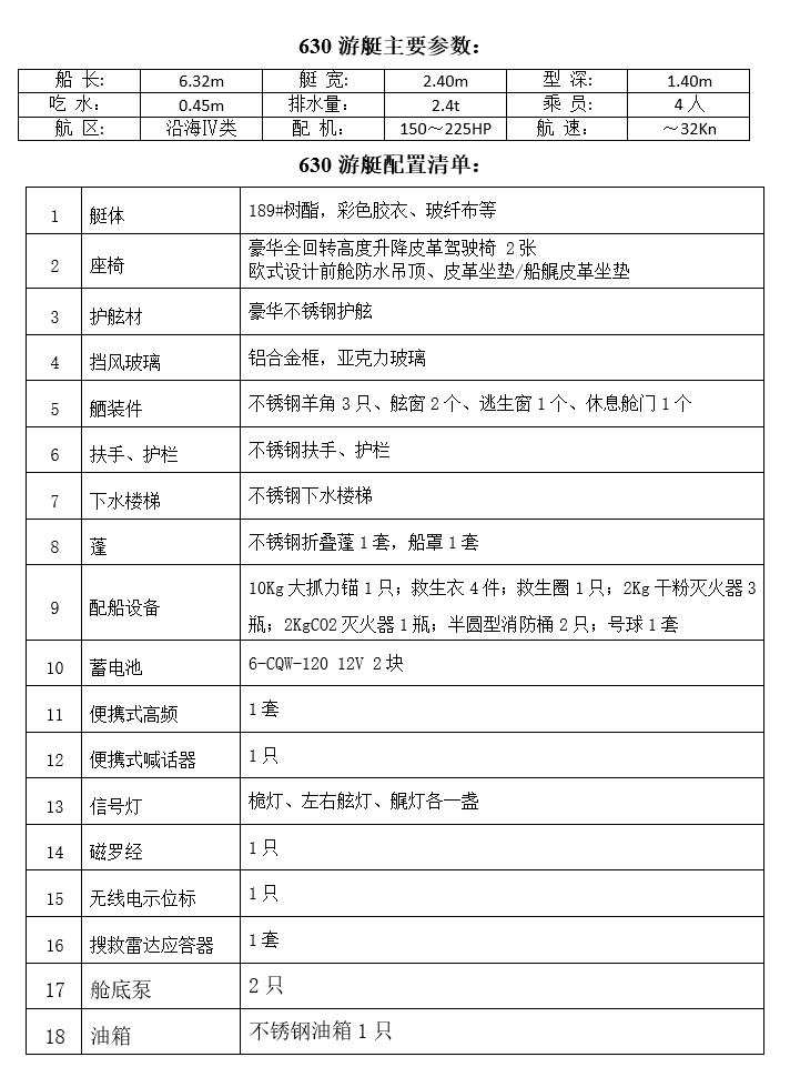 简述: 分类:快递-敞开系列 名称:630游艇 长度:6.32米 总宽:2.40米 型深:1.40m 主机功率:150-2250马力 航速:~32Kn 乘员:4人 航级:沿海Ⅳ类 关键字:630游艇