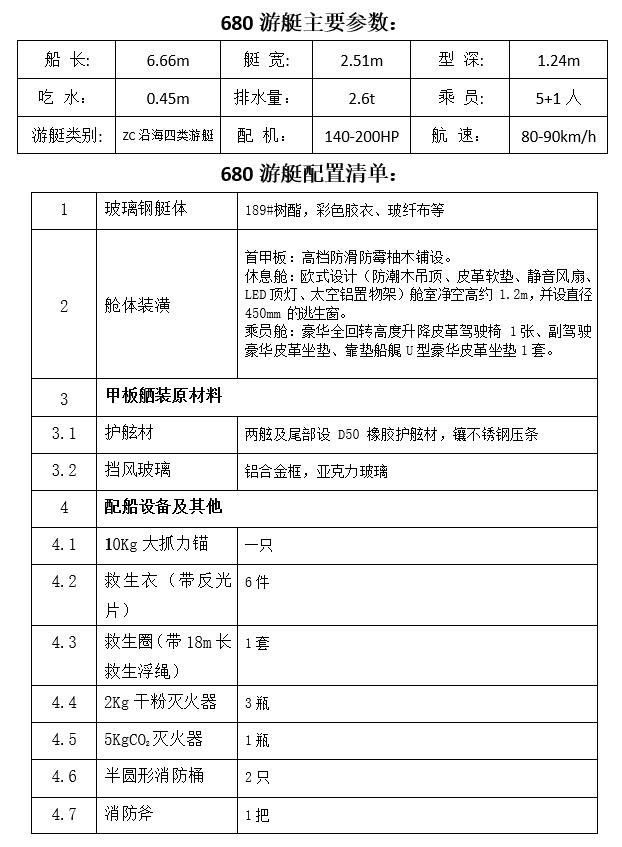 简述: 分类:运动休闲系列-运动快艇系列 名称:680游艇 长度:6.66米 总宽:2.45米 型深:1.24米 配机:140~200HP 航速:~32Kn 关键字:680游艇